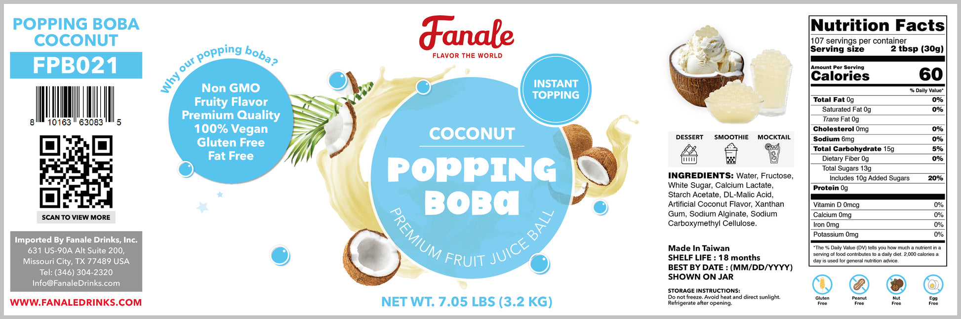 Fanale Popping Boba contains approximately 12-14% real fruit juice. The jelly coating of the popping boba is made of seaweed extract. Each serving of popping boba is approximately 30 Calories.