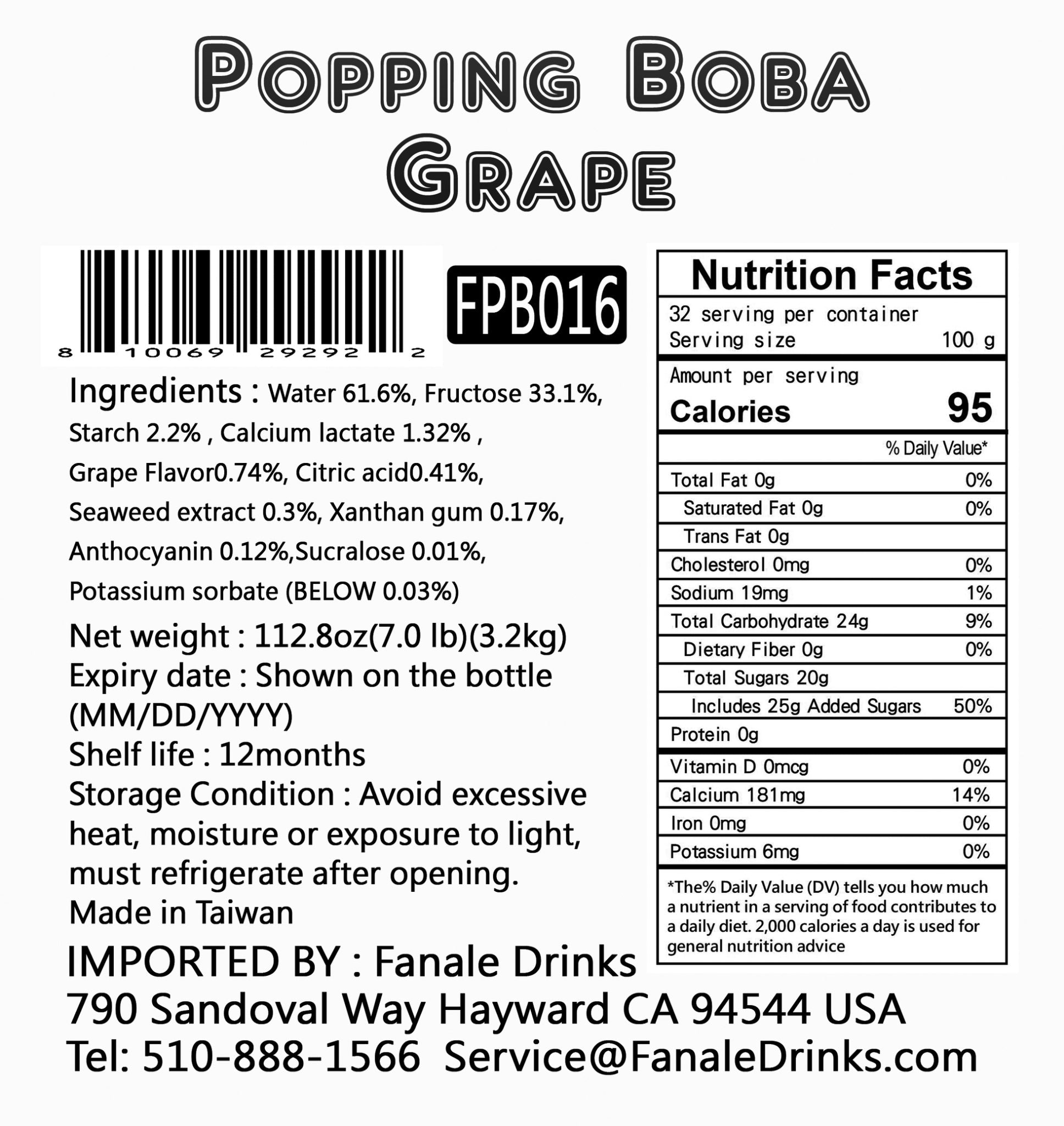 Fanale Popping Boba contains approximately 12-14% real fruit juice. The jelly coating of the popping boba is made of seaweed extract. Each serving of popping boba is approximately 30 Calories.