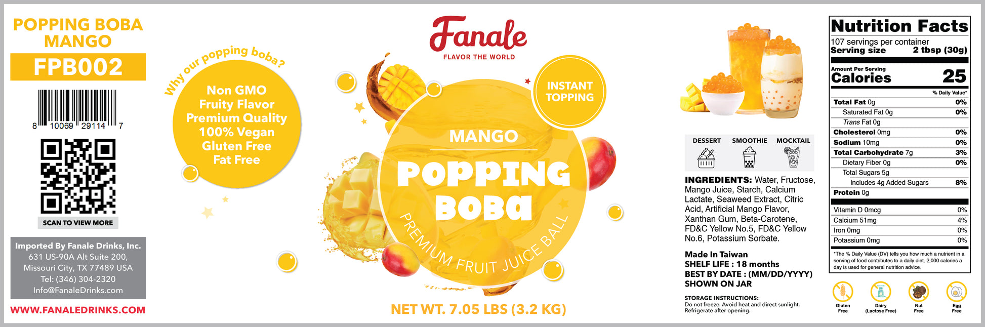 These popping juice balls are also commonly known as popping or bursting boba (boba is the chewy tapioca pearls commonly found in boba milk tea). Similar in size, these juice balls add another dimension of flavor! It is coated in a clear slightly gummy skin with real mango fruit juice flavor inside. Throw it in the mix!