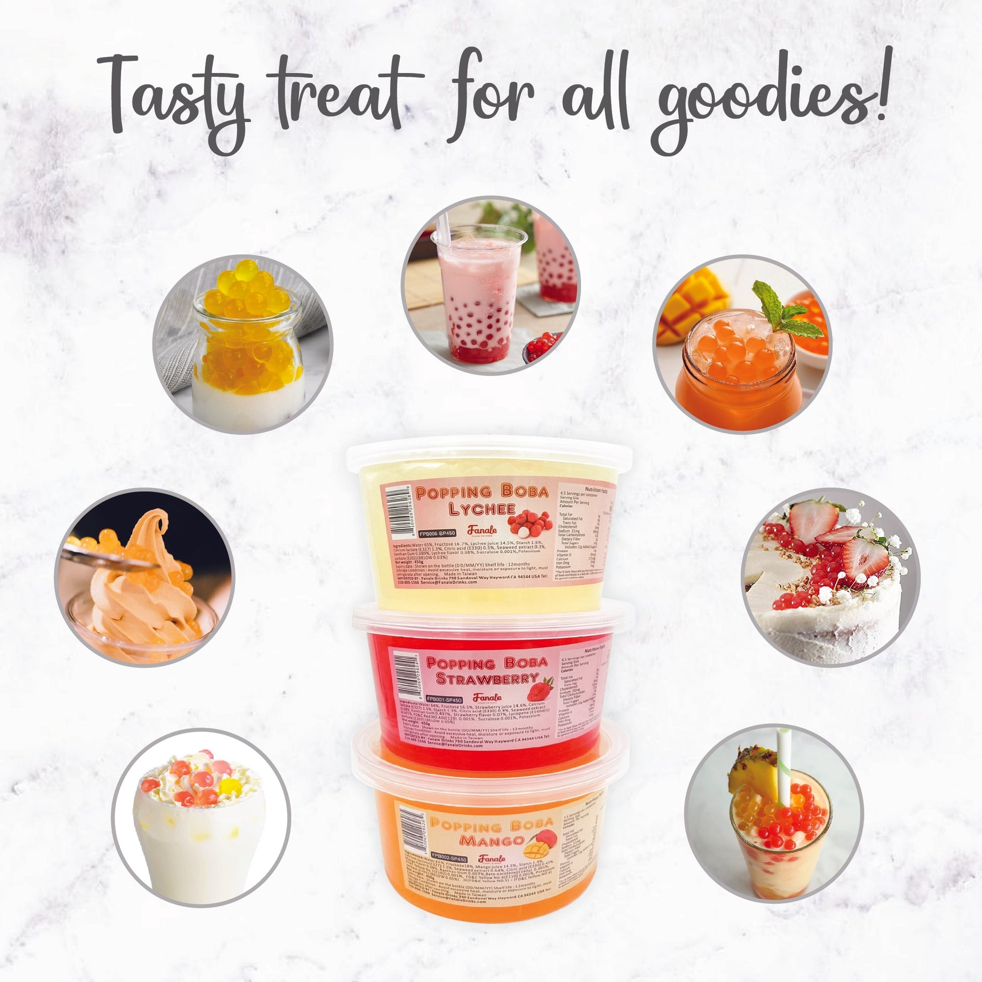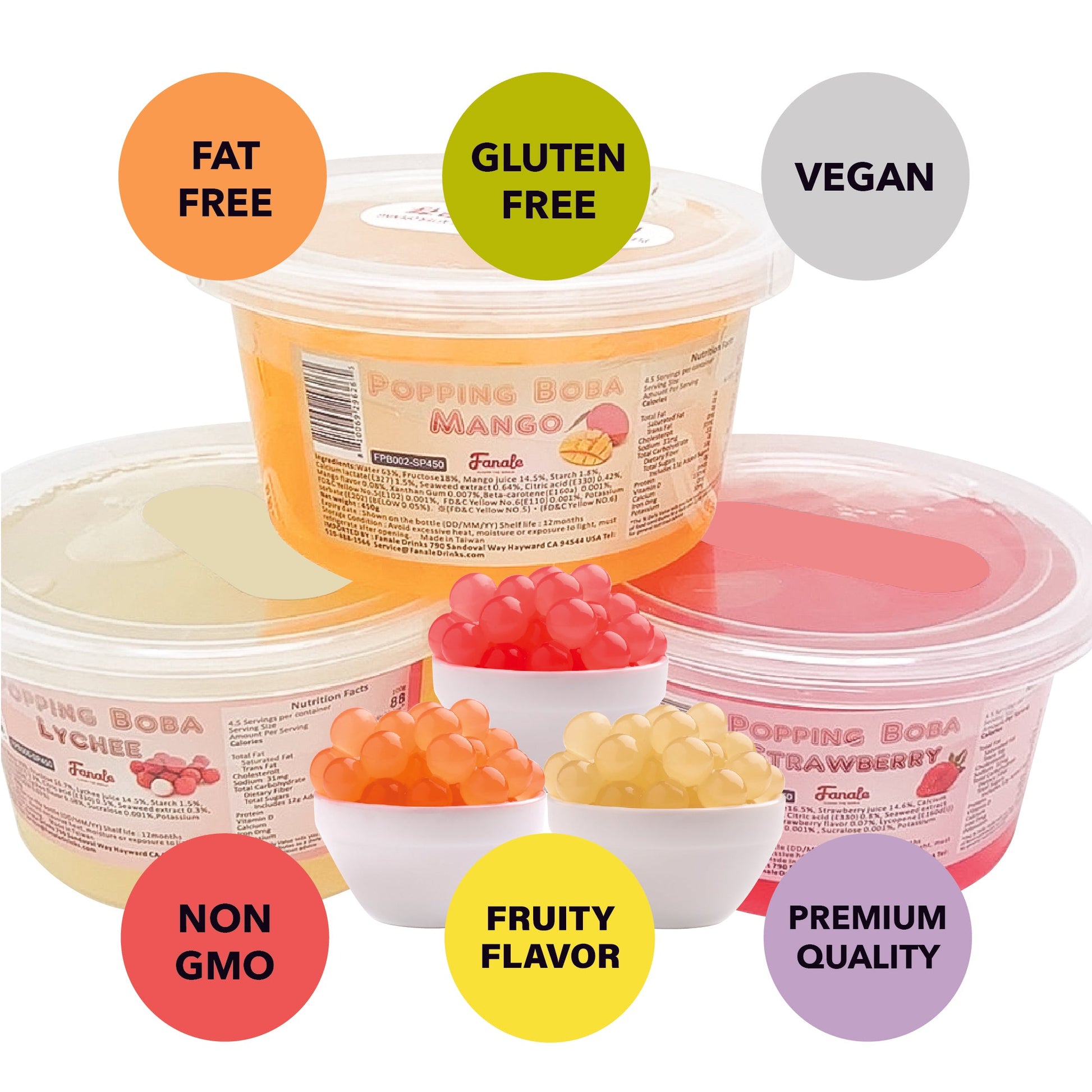These popping juice balls are also commonly known as popping or bursting boba (boba is the chewy tapioca pearls commonly found in boba milk tea). Similar in size, these juice balls add another dimension of flavor! It is coated in a clear slightly gummy skin with real mango fruit juice flavor inside. Throw it in the mix!