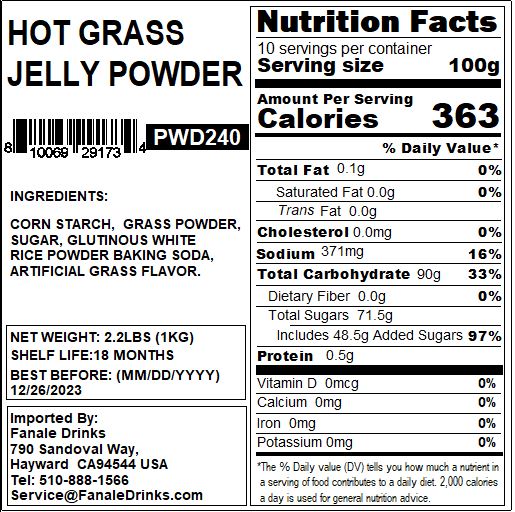 A very concentrated Grass Jelly Powder. Mix with water to create 35 to 40 times amount of grass jelly. Each bag can make approximately 60 Pounds of Grass Jelly Pudding.