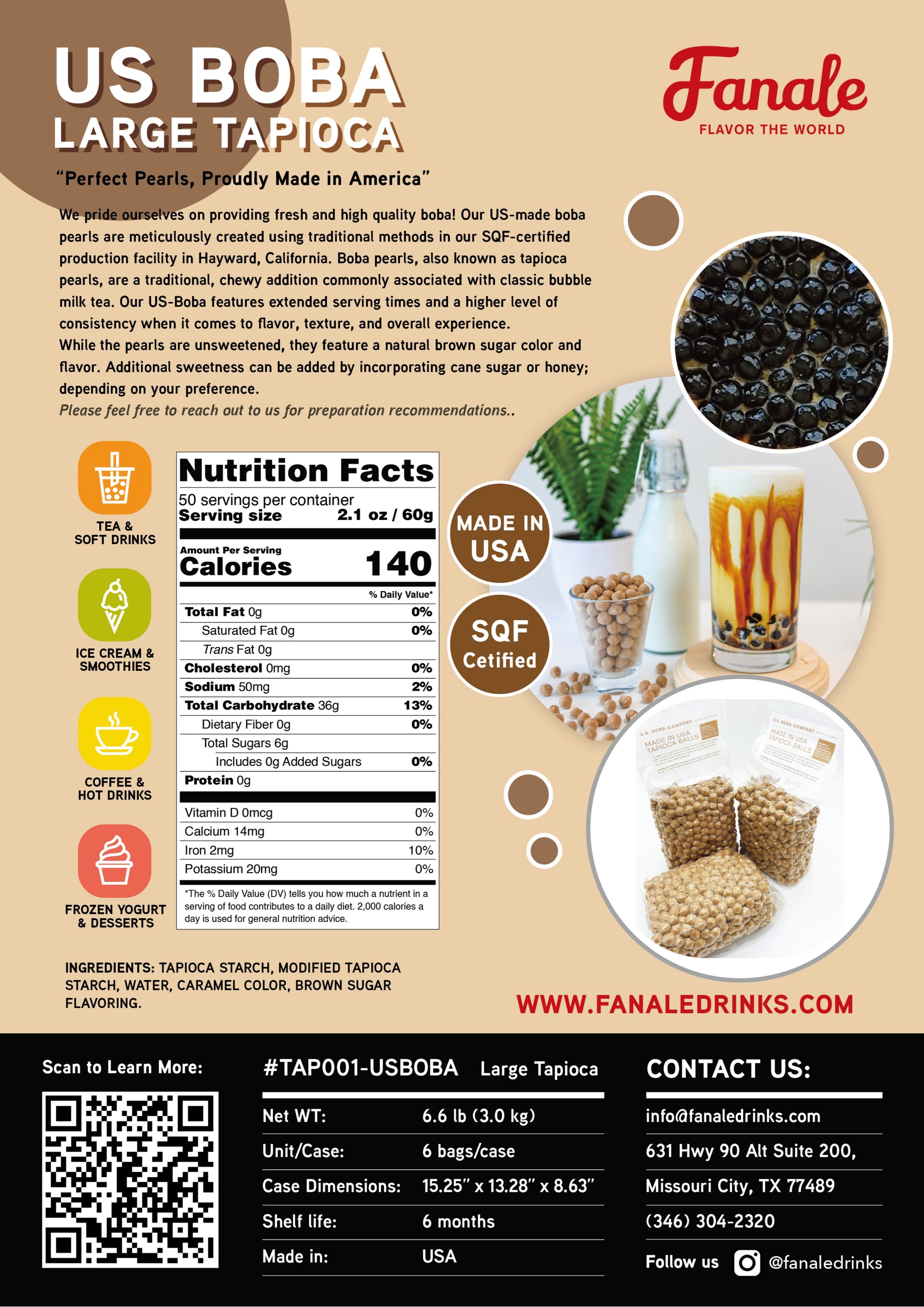 Tapioca Boba (aka pearls/bubbles) are a chewy traditional drink addition, that is a characteristic of traditional bubble milk tea. Our US Boba is exclusively made in the US! It is unsweetened but comes brown sugar colored and flavored. You can add additional sugar or honey to sweeten it. It is 2.3cm in diameter after cooking.